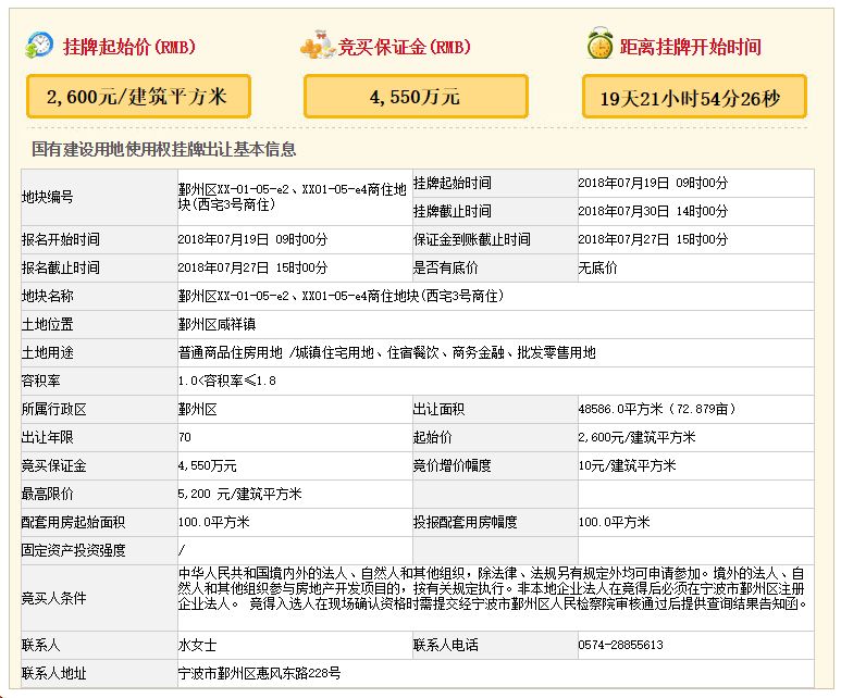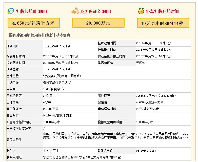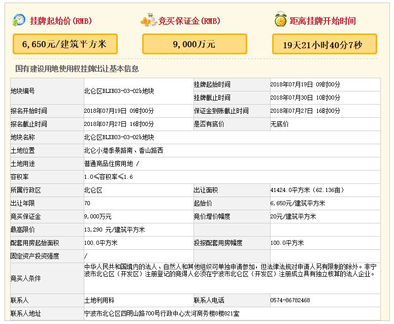 上午场同时竞拍的还有北仑小港片:BLXB03-03-02b地块,该地块坐落黄山西路以南,环山路以西。出让面积达41424㎡,可建面积达6.6万方,容积率1.0-1.6,挂牌起价6650元/㎡,限价13290元/㎡,另需建设2500㎡的社区配套用房,建成后将无偿转交于相关政府单位。