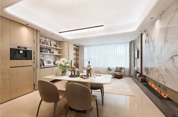 着眼室内,在建面约184㎡户型中,地面选用保加利亚黑和奥特曼米黄,采用无缝水刀拼花工艺,尊贵感和仪式感油然而生!