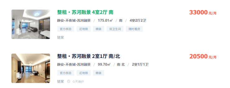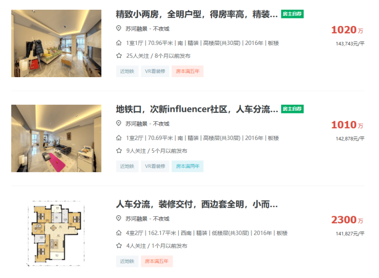 苏河融景自身也有二手挂牌,无论是70㎡左右的小户型还是160+㎡的大户型,挂牌均价都超过14万/㎡!