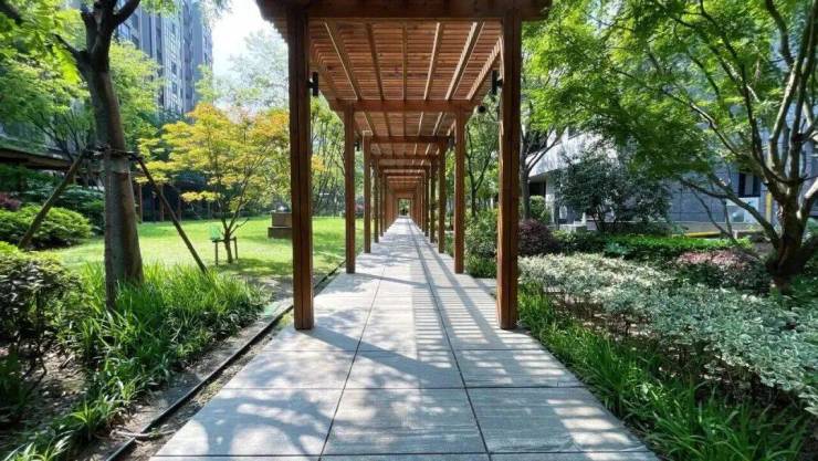 映月亭台、枫林广场、曲径散步道、南北花廊,这四大主题空间共同构成了一个具有“度假感”的社区核心。