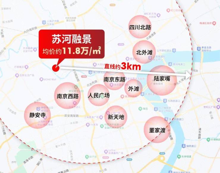 你看地图,如果把视角放大到3公里半径,范围内江涵盖陆家嘴、人民广场、静安寺、南京西路、南京东路、外滩、新天地等城市CBD,上海几乎所有的高能级城市资源都在苏河融景业主的生活场域之内!