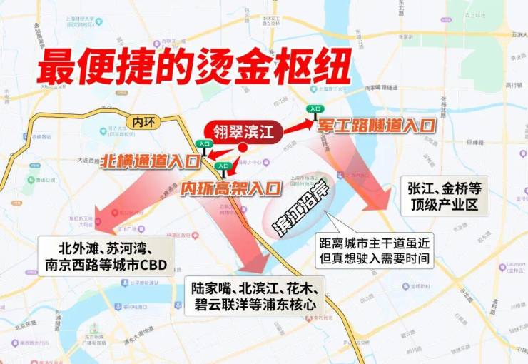 其他滨江一线的项目,想要去往浦东、浦西核心商圈,都要绕到翎翠滨江所在的片区,才能驶入快速路网。
