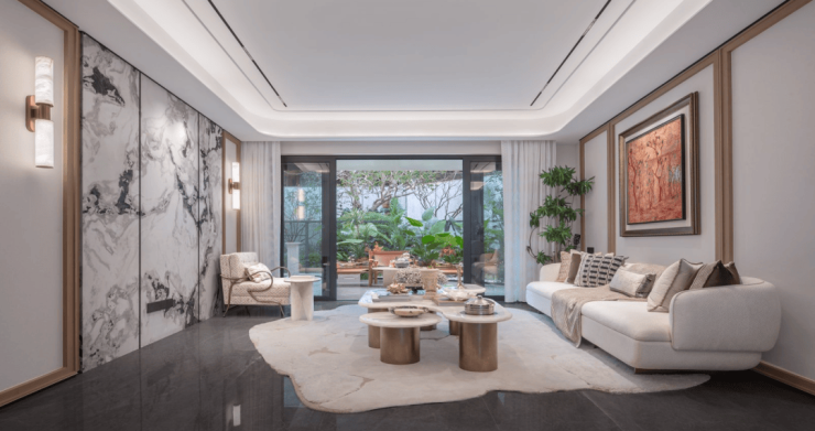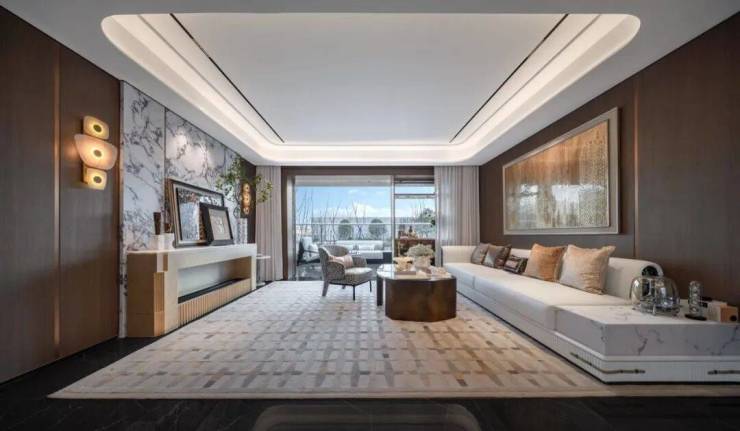 入户大堂更是对标悉尼嘉佩乐酒店,约250㎡阔绰空间,奢石接待台、水刀拼花地面、非遗苏绣屏风,处处彰显豪宅质感。暖调空间搭配精致工艺,满满的归家尊崇感。