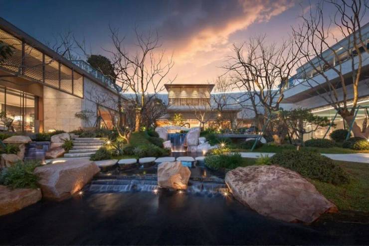 利用高差形成立体观景视野,以玉为心、以水为魂,叠瀑流水、松石相映,走进去像一幅立体山水画。