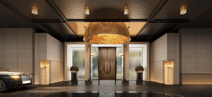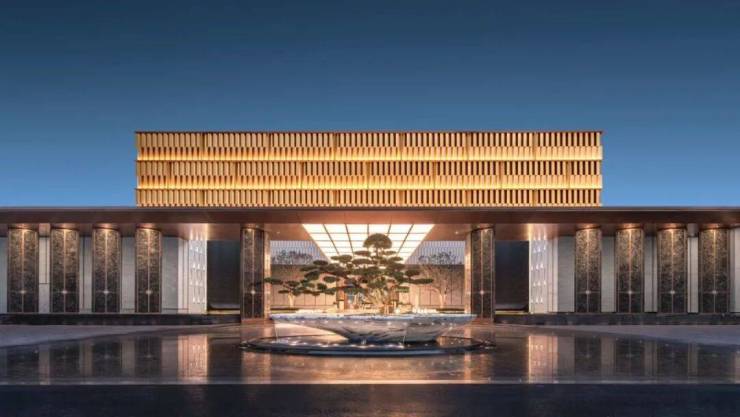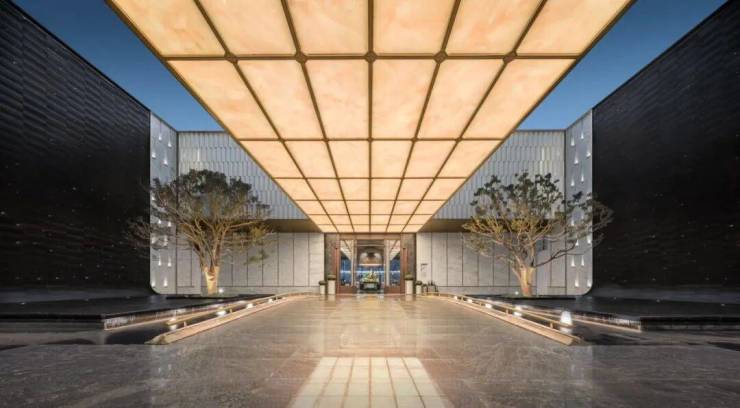 约88米苏韵威仪大门,搭配11米高流光宝顶,由1888块幻彩铝板构筑,采用保时捷、宝格丽酒店同款材质,璀璨大气、质感厚重。