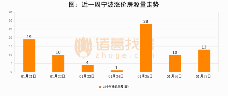 根据诸葛找房数据显示,宁波24小时涨价房源量为13套,较01月26日增加3套,环比上涨30%。与此同时,涨价房源占比小幅扩大,业主信心有所提升。