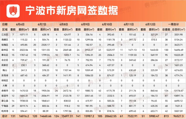其中鄞州区成交130套,余姚市成交124套,奉化区成交95套。