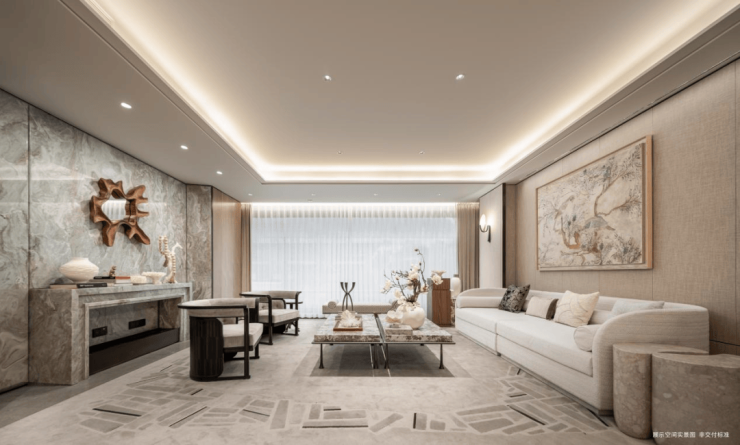 墙面,严选安第斯雪或晓山青珍贵石材,与木饰面、特色定制墙布组合设计;客厅、餐厅、卫生间等区域地面定制石材,赤足走过,温润细腻的触感。