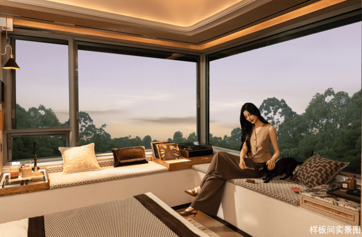 ·270°无柱飘窗的主卧套设计,打造出一座“空中观景舱”,将晨昏光影、四季流转尽数收纳,极大拓展了生活的视觉与心理边界,推窗即览美景,让居家时光更具诗意。