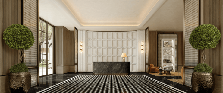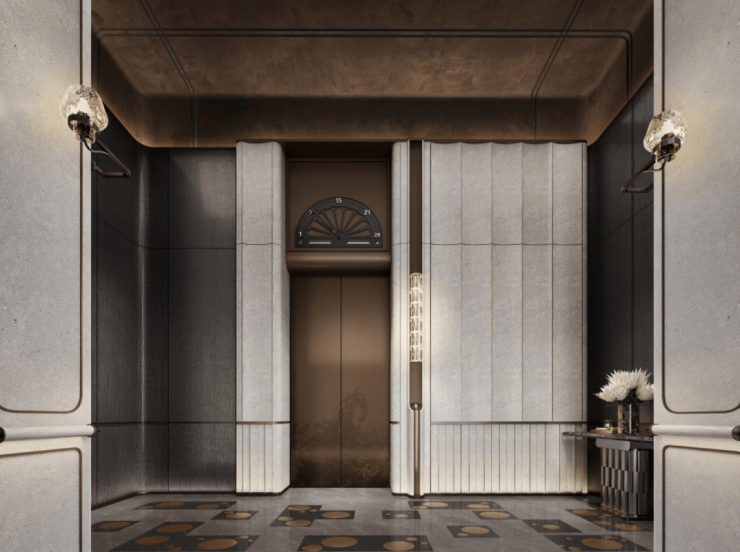 此外,相较于常规顶豪中奢石的简单铺贴,绿城黄浦ONE注重石材的艺术化设计——通过精心设计的拼花设计与错落有致的造型组合,赋予石材墙面艺术表现力;