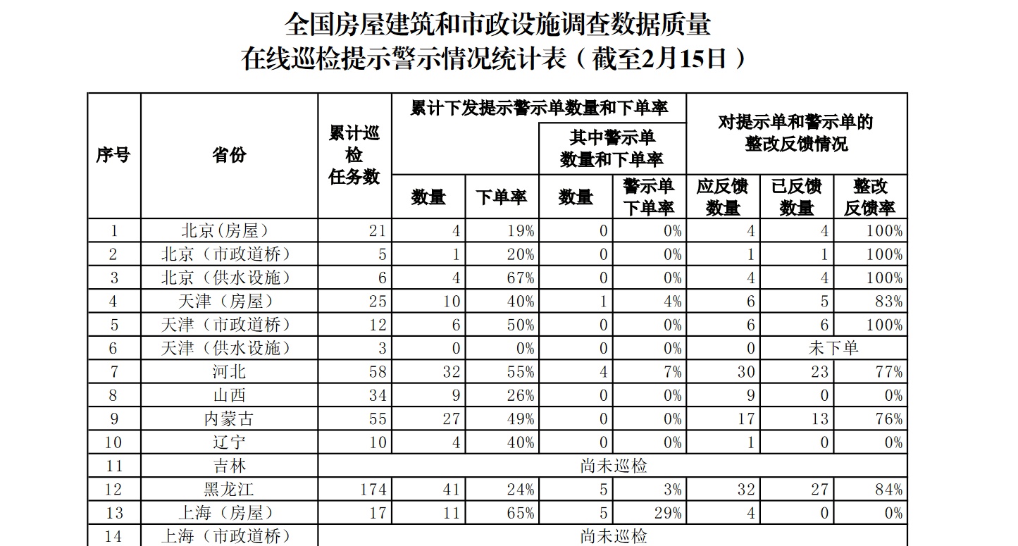 《通知》指出,排名前列次全国自然灾害综合风险普查房屋建筑和市政设施调查正在全面展开。为确保调查数据质量,住建部建立了在线巡检制度,根据专家审定的巡检结果及时下发数据质量提示单和警示单。