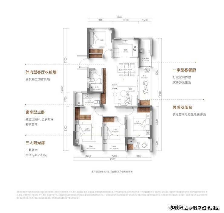户型方正,没什么浪费面积,虽然是中间套设计,但做到了全明户型,通风效果好; 南向三开间,双联阳台+飘窗,南向采光充足 ,阳光满堂; 超配S墙 ,隐藏收纳柜,让小家越住越大,可以说杭州少见。