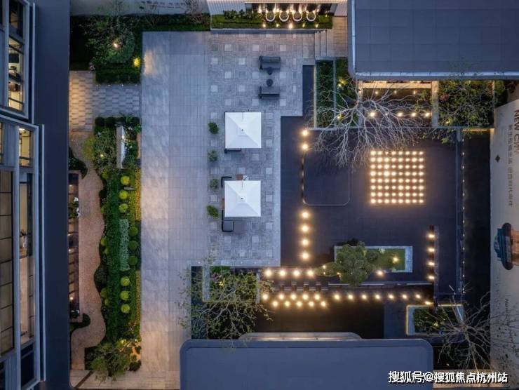 入口两侧油橄榄树姿态优雅,自带松弛感;归家序厅两侧有种植桂花树,隐喻"蟾宫折桂"的祝福;地面铺装芝麻黑花岗岩与福鼎黑花岗岩,不仅沉稳大气还有活泼灵动……