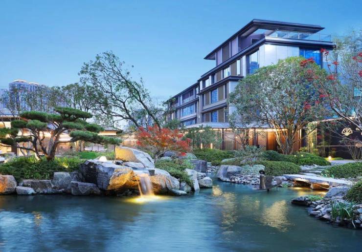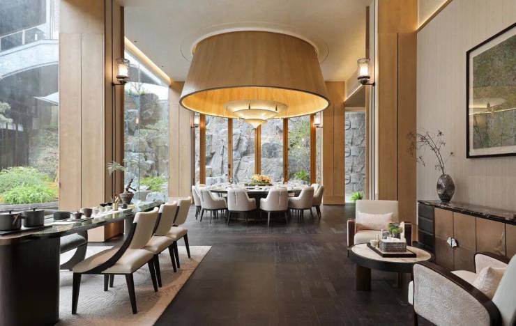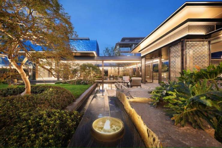 ▍出门即城市,步行即公园,咏月望庐是杭州在售的一线水景房中,难得的直面水岸,中间甚至没有车行道路分隔的项目,交叠的露台、院子和超高地下室,将白鹭、睡莲和绿洲一并“私藏”。