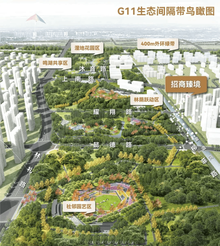 项目西侧直面约百万方城市森林公园。整座公园(在建中)划分成湿地花园区、鸣湖共享区、林荫跃动区和社邻园艺区四个功能分区。不是随便种点树就完事,是真正能走进去、能待得住的那种公园。