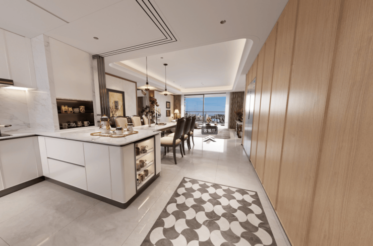 海派精装细节:舍弃千篇一律的标准化装修,采用耗时费工的弧形吊顶、水波纹玻璃移门、整排玄关收纳柜,厨房全岩板墙面,细节品质碾压同价位竞品
