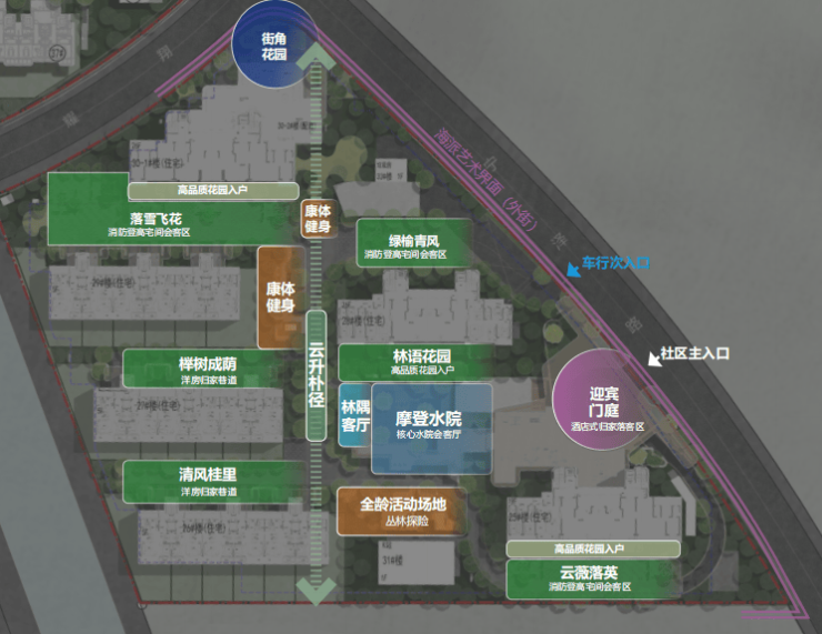 社区规划:总建筑面积约30万方,容积率2.2,绿化率35%,车位配比1:1.3,全人车分流