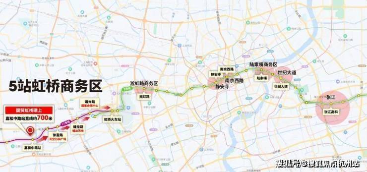 从嘉松中路站出发2站即到徐盈路站(天空万科广场)、3站蟠龙路站(蟠龙天地)、4站诸光路(国家会展中心)、5站虹桥火车站(虹桥商务区)并无缝换乘2号线。
