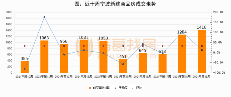 进入2024年第49周(12月02日-12月08日),宁波新建商品房成交1418套,较上周增加164套,环比上涨13.1%