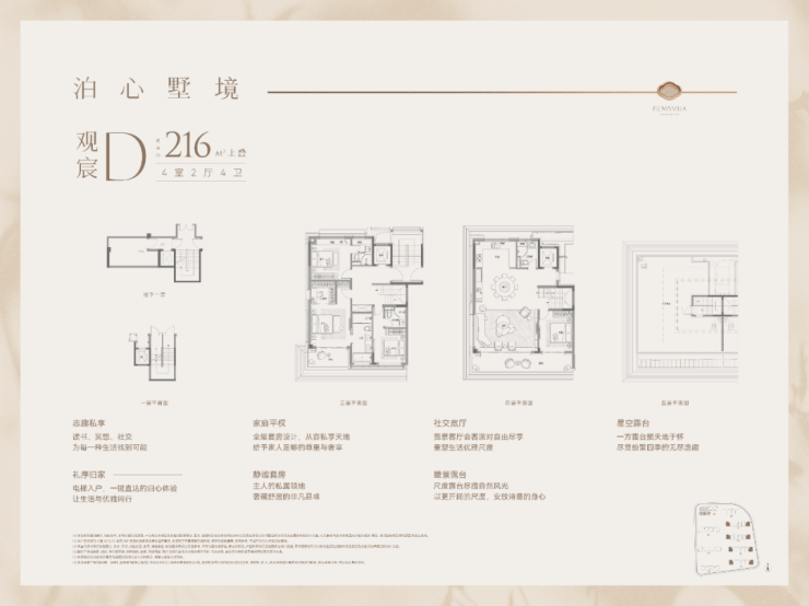 天地墅境,以宽奢尺度勾勒理想生活。LDKB一体化会客厅设横向阔绰开间,搭配约 3.3 米层高,空间开阔无压抑,轻松承载社交与日常;奢阔厨房与餐厅自然相连,U形台面+独立餐边柜拓展操作与收纳空间:居住层三套房设计,主卧套房配独立衣帽间与卫浴,各空间尺度充裕,尽显居住体面....