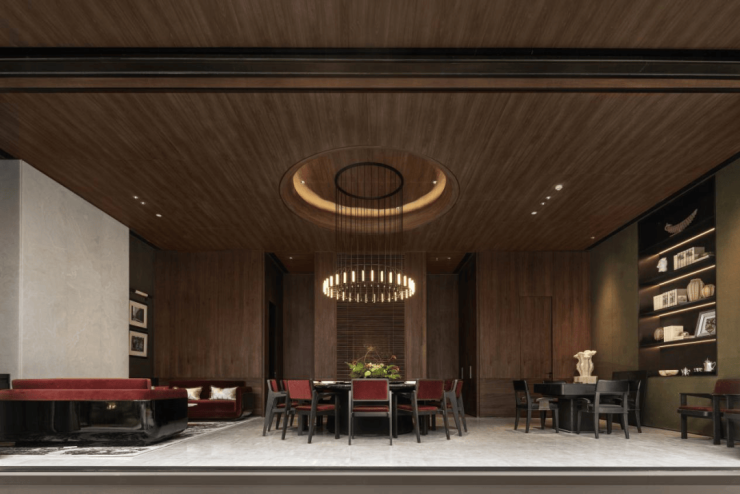核心景观中有一座“冷翡翠玉石桥”,冷翡翠属于已停止开采的顶级奢石,通常仅在豪宅室内做把手或摆件点缀,中海选择将它满铺整桥,桥面弧形纯手工打磨,单桥价值超百万元。会所内部,吧台采用皇家白玉整石打造;架空层墙面大面积使用定制木饰面,触感温润,细节收口严丝合缝。从地面到墙面,从室外到室内,每一处都指向同一个标准:顶奢酒店化。