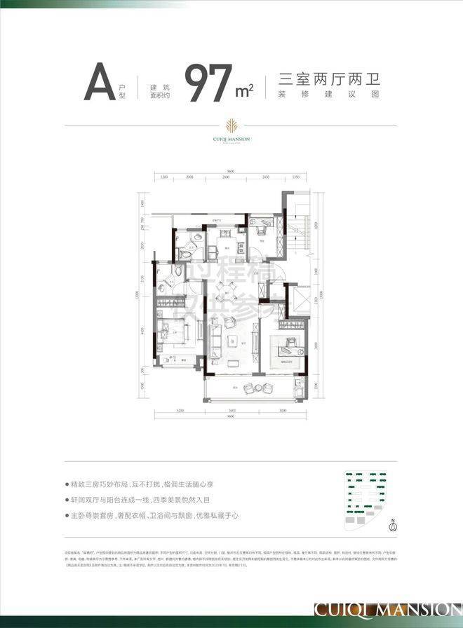 户型:主推建面约97-139㎡户型,其中97㎡为三房两卫三开间朝南,139㎡为四房两厅双阳台设计,餐客厅开间达6.7米,全屋精装交付(含地暖、中央空调、老板电器等)。