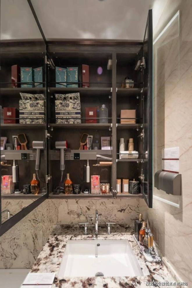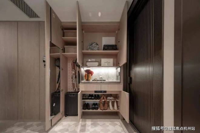 小户型最让人担心的小户型的收纳问题招商序给出了自己的解题思路,让我们看看它的收纳空间,首先是一整排的玄关收纳,玄关柜据说可以放下28双高筒靴,而且是大理石的台面石,另一侧的储物柜是一个容量较大的落地柜,足够收纳一个大行李箱,背面还贴心设置了洞洞板,可以悬挂雨伞、包包等物品,整个玄关柜是天然木皮鸡翅木包裹,非常高级,预留S墙的设计轻松收置双开门冰箱、厨房与卫生间采用了模块化的收纳系统,通过碗碟拉篮、谷物抽、不锈钢开架,贯穿式镜柜与美妆冰箱等收纳道具,将日常用品归置的仅仅有条,114主卧更是预留了超大的衣柜空间。