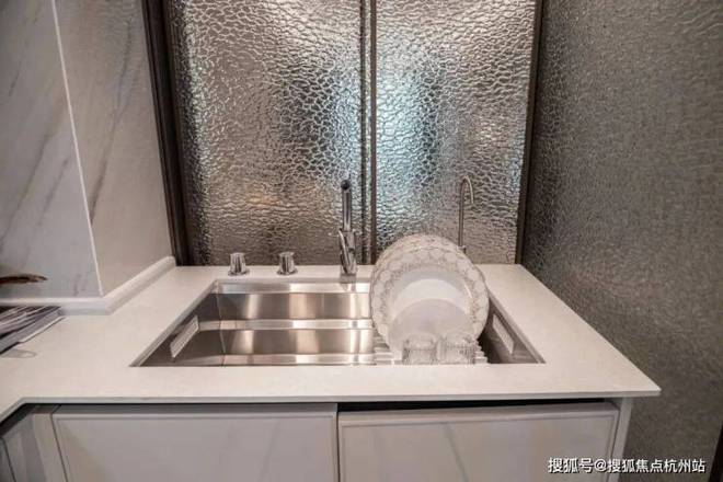 除了户型尺度,招商序的展示空间用料也是在700万这个量级难逢敌手,整个展示空间,除了卧室的拼花地板,其他区域的地面与墙面几乎全是岩板与奢石。连卫生间墙面都做到了岩板通铺....这种用料一般只有千万级的豪宅才能看到,114的客厅背景墙也采用了天然大理石搭配岩板交付,岩板因工艺复杂、性能优异,多用于高端场景,招商序厨房、卫生间墙面地面,客餐厅地面连通阳台,全部通铺岩板,可见硬装投入度之高。