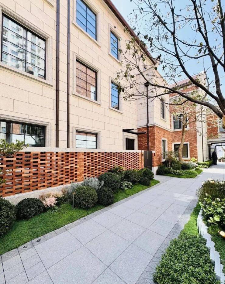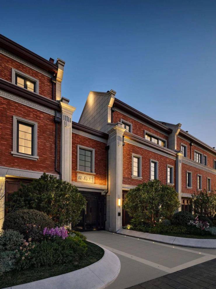 海派里弄风貌复刻:融合石库门空间秩序与现代极简风格,红砖立面+干挂石材+大面积玻璃幕墙,兼具人文底蕴与顶豪质感