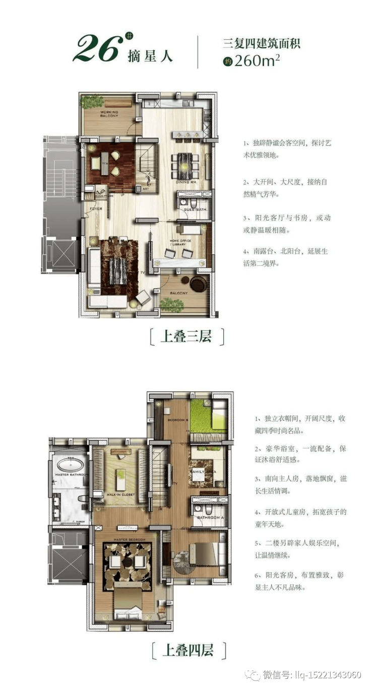 叠加别墅:建面约260-280㎡,分为上叠(3-4层)和下叠(1-2层+地下室),主力为4室设计