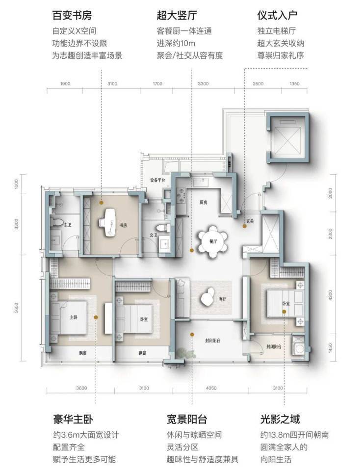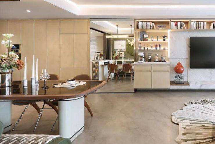 ▲ 139㎡户型采用大跨度结构,客餐厨一体化空间内无承重柱干扰,为未来功能重组预留条件。X空间百变书房可根据家庭周期自由开合。