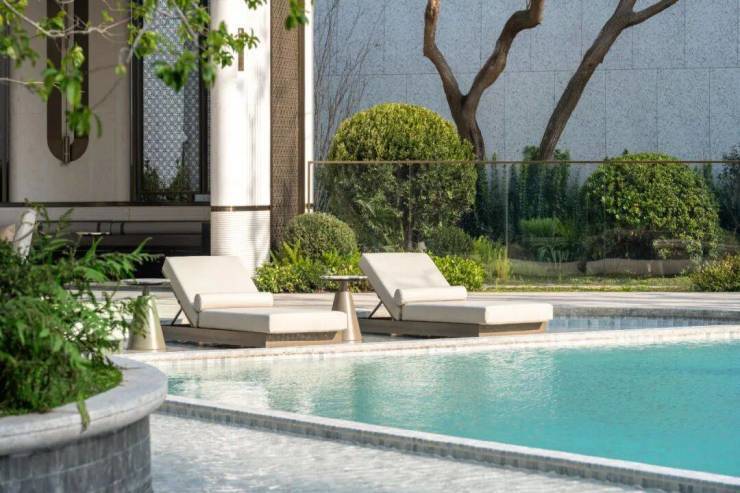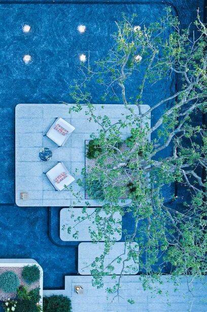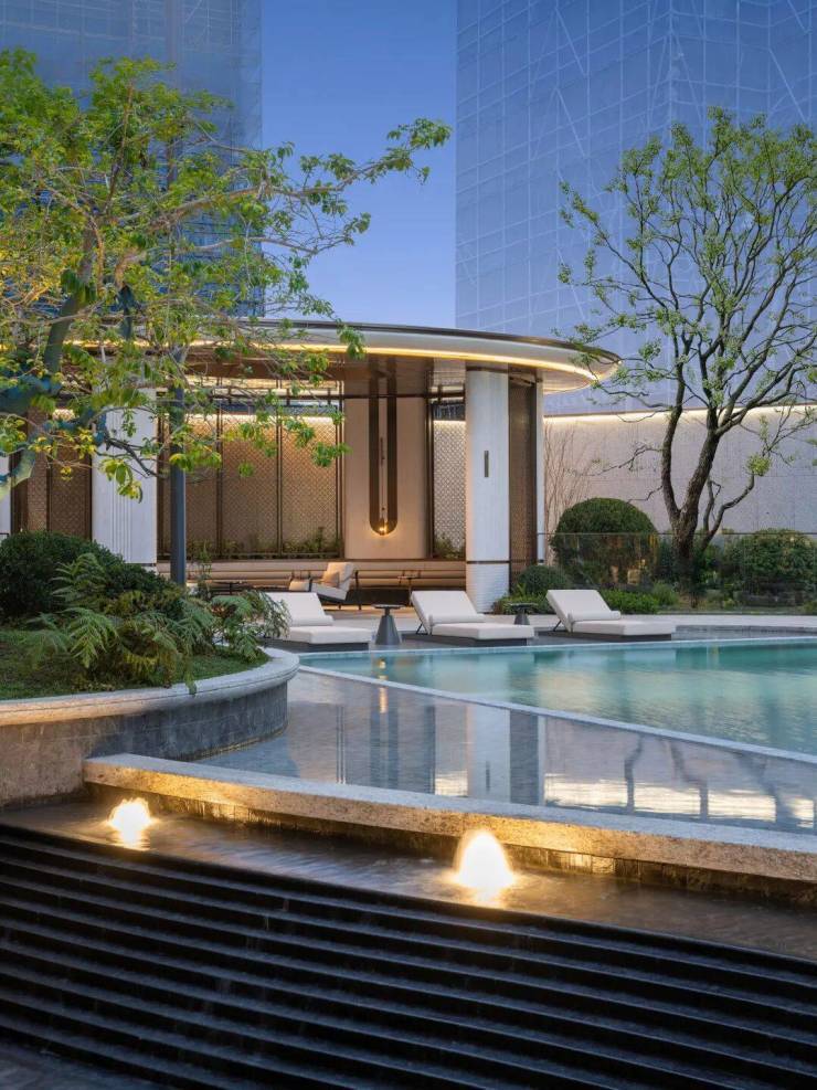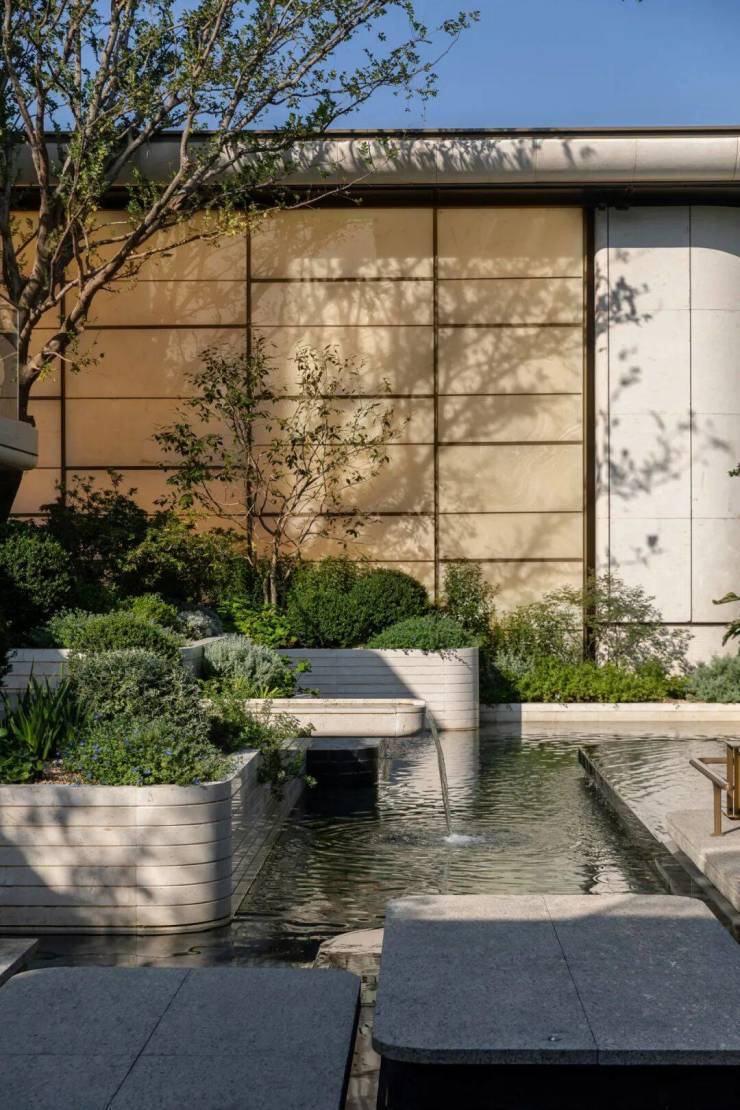 以立体泳池为空间锚点,水院、下沉庭院与架空层在不同标高上层层展开,打造出超级立体洄游式水景花园。水在不同标高间流动、跌落、静止,形成丰富的感官层次;人在不同界面间穿行、停留、相遇,完成从公共到私密的空间过渡。