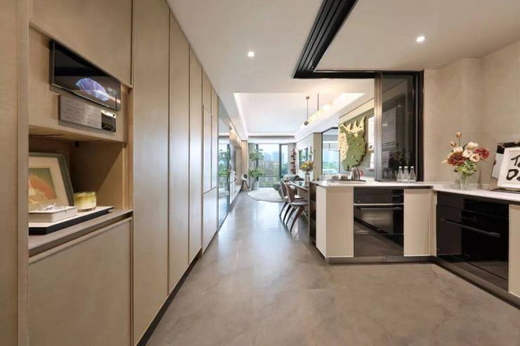▲ 105㎡户型入户玄关柜采用智能分区设计,依据使用频率与物品尺寸进行模块化划分,S墙设计更在厨房与餐厅之间形成嵌入式冰箱位,让走道面积被复合利用。