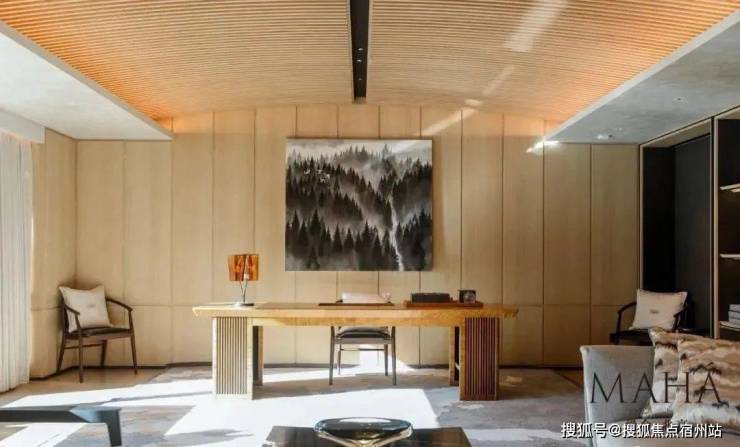 甚至于抬头所见,吊顶都做了多处圆弧形处理——只是为了不过份尖锐,柔化边缘,让视觉看上去多有变化。弧线的协调往往能带来一种独特的、百看不腻的美感。