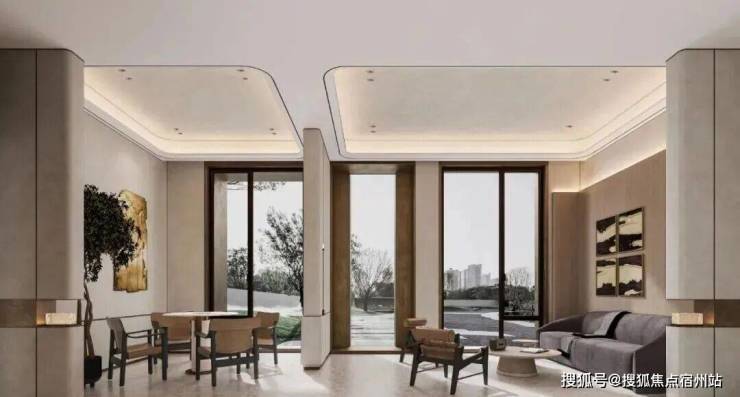 室内设计,秉承摩登东方的理念,设计以人、生活为中心,从空间本体和情感层面都回归生活,270度环幕采光,开放式会客厅设计,兼具尺度感与功能性。