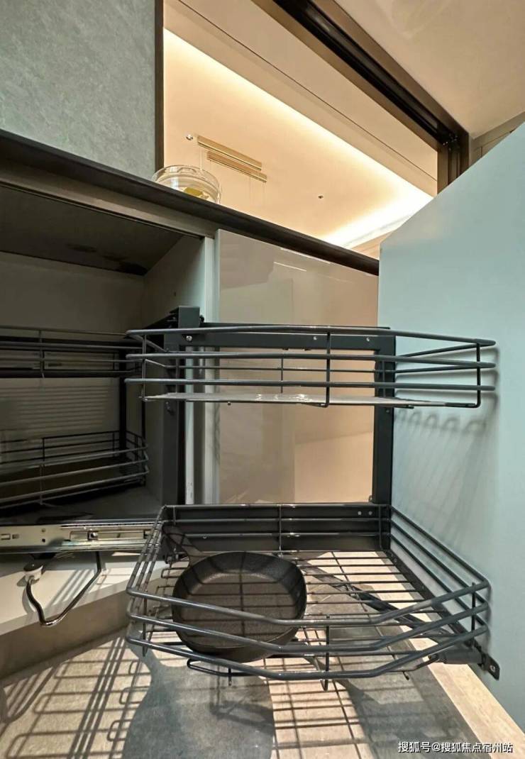 下方的橱柜则做了转角拉篮,充分利用转角空间,使物品井然有序的同时,轻松方便取放。