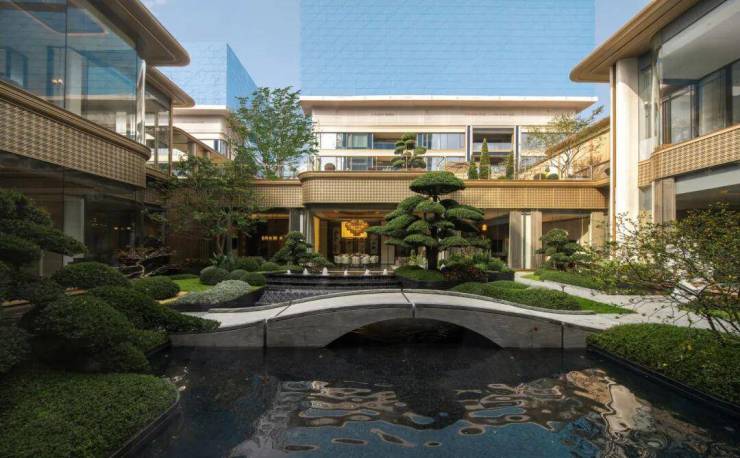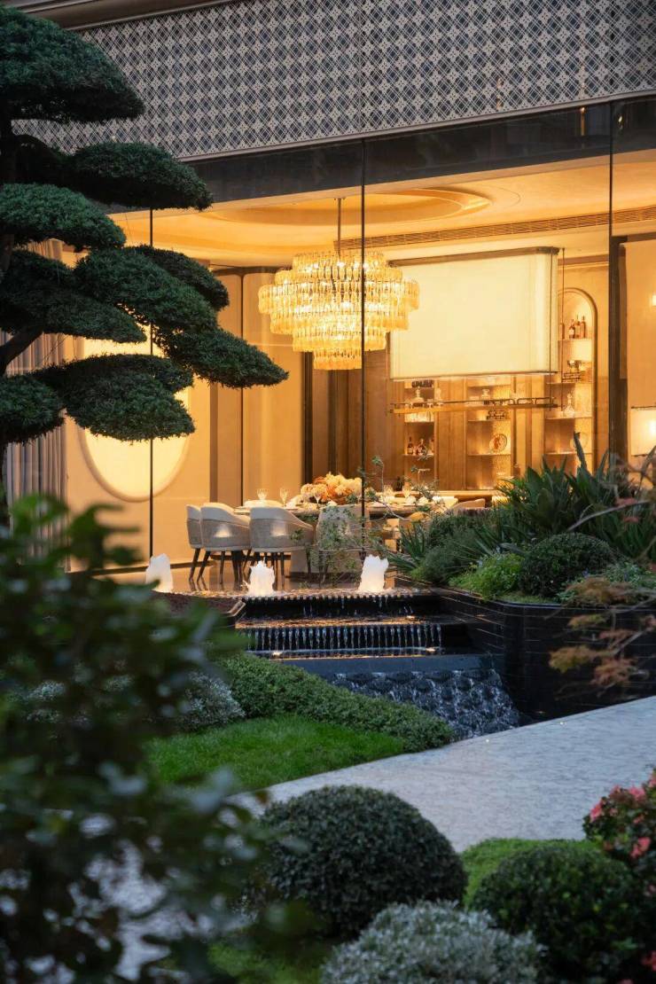 下沉式庭院,对标京都安缦的打造理念,将园林景观与室内空间呼应,形成隐于林间的奢华度假感。