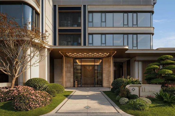 项目大门采用了杭州首个Art Nouveau的新艺术风格,入口横贯约80米,主楼约40米,大门由六扇曲面奢石墙体构成,采用大面积的维多利亚白奢石,端庄典雅、恢弘大气。加之大门顶部设计“金色流苏”装饰、曲线设计,工艺非常考究,当之无愧的城市级封面。