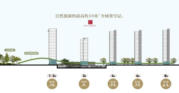 为了最大化内外景观视野,整个社区规划了行业标准内出挑的一层架空层,最高的10米,主体7.9-9米,最矮的也有6.3米。