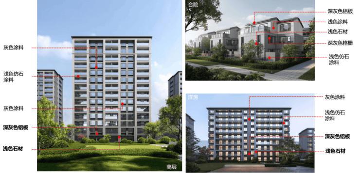 星缦和润城整体建筑风貌以精致有力的线条为主要构成元素,且具有简洁通透的立面。项目建筑设计合理呼应这两种城市设计元素。灰白对比的主色调,突出典雅的调性。保留宋式传统元素,并通过大面积玻璃、涂料、首二层石材+铝线条等简洁而现代手法,匹配现代品质生活。