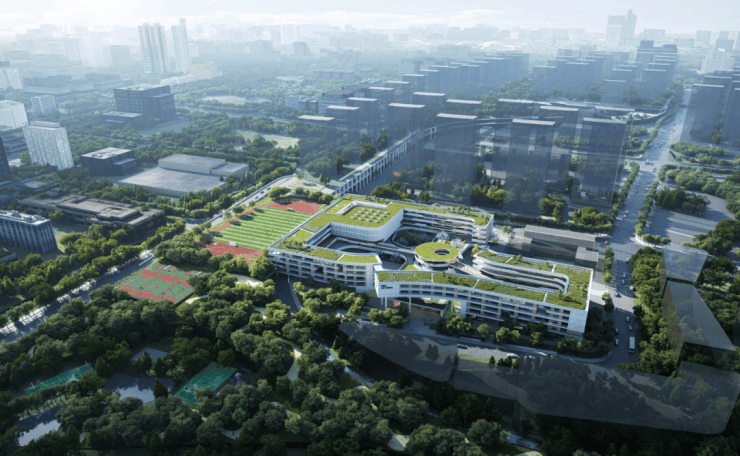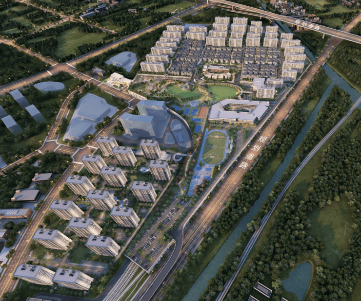 整个项目由两宗地块组成,占地约425亩,总建筑面积约48万㎡。 是一座涵盖约4.5万㎡公园、幼儿园、九年一贯制学校、文体中心、邻里中心等复合业态的超大“公园城市”。
