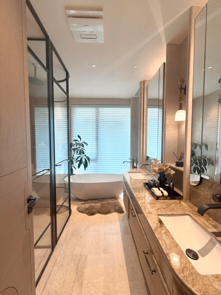再加上双台盆、浴缸、马桶、淋浴的豪华四件套,把顶豪的尊崇感渗透到每一个日常场景。