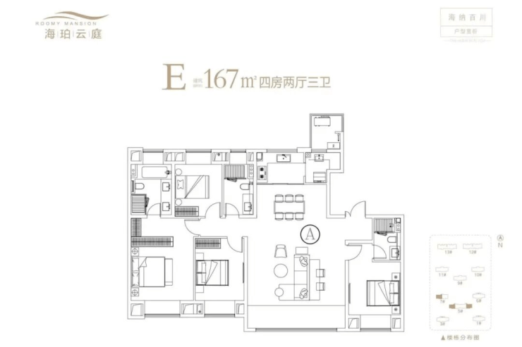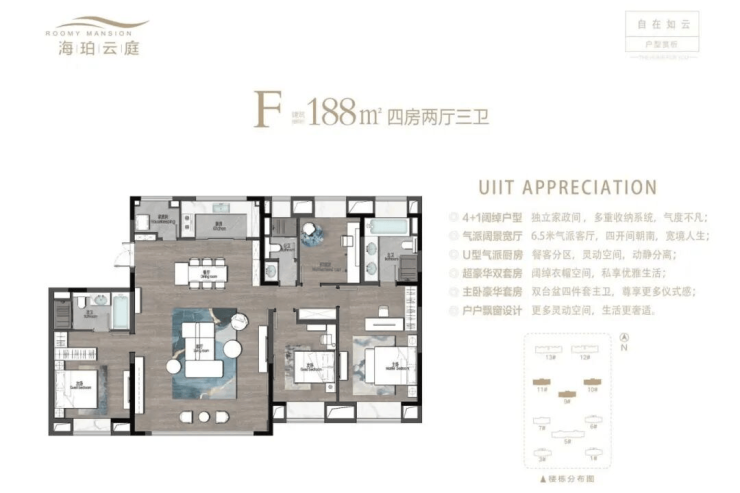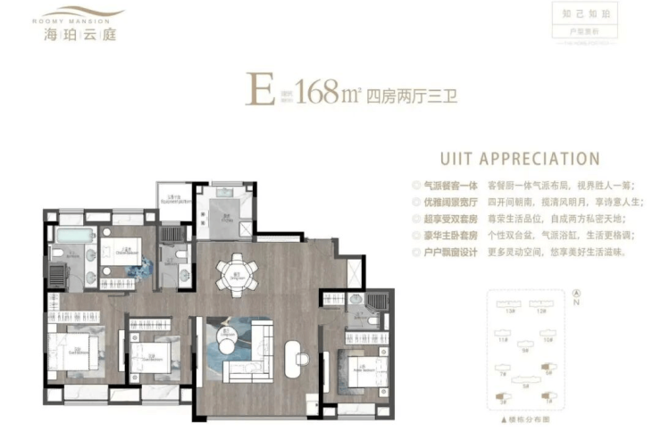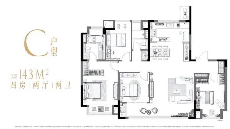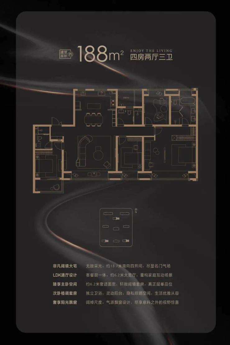 户型:142㎡(已售罄)、166㎡(四房两厅三卫),188㎡(四房两厅三卫)