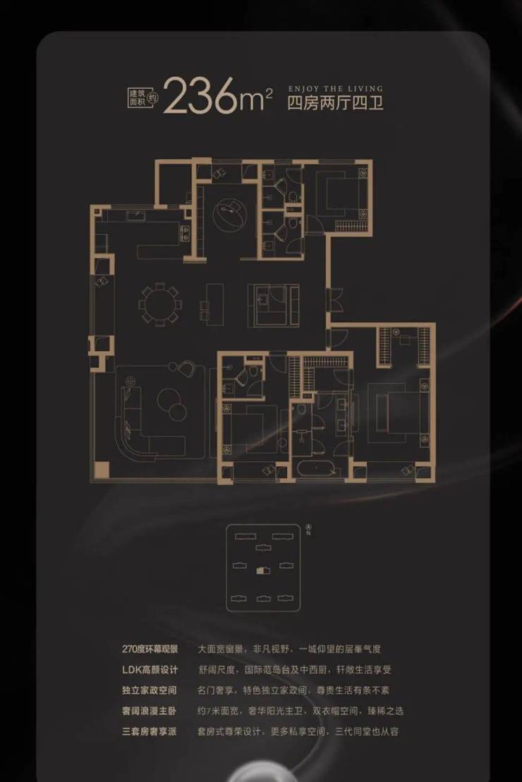 户型:149㎡(4室2厅2卫)、169㎡(4室2厅3卫)、189㎡(4室2厅3卫)、236㎡(4室2厅4卫)