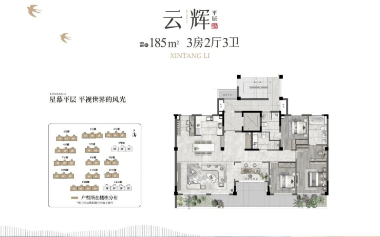 户型:下叠224-363㎡(4室3厅4卫)、上叠208㎡(4室2厅4卫)、平层185㎡(4室2厅3卫)