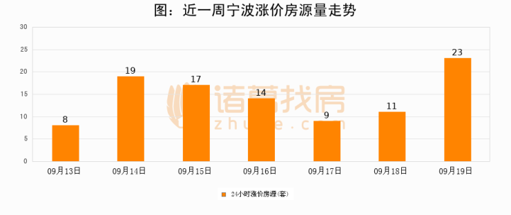 根据诸葛找房数据显示,宁波24小时涨价房源量为23套,较09月18日增加12套,环比上涨109.1%。与此同时,涨价房源占比小幅扩大,业主信心有所提升。