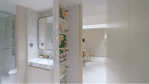零食柜在华润置地的项目中或许并不稀奇,但这里的零食柜却有着独特的巧思,就连卫生间的墙体也成为收纳空间的一部分。
