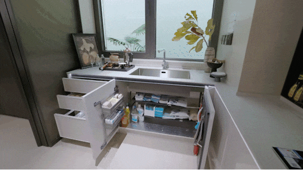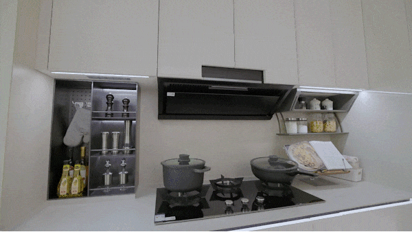 配合抽拉置物架、地柜联动拉篮、天使下拉拉篮、三重骑马柜、随心抽、窄柜高深拉篮的组合拳,每一种都像是为不同的物品量身定制。