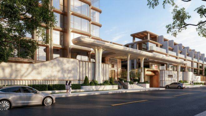 项目立面设计堪称点睛之笔:以现代简约的森系造型为形,香槟金的流动曲线为韵,厚重石材的品格为骨,珐琅的历史印记为魂。