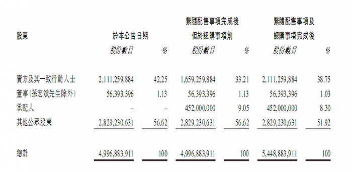 根据公告,本次配售及认购事项完成后,卖方及其一致行动人士的股权将由约42.25%降至38.75%,资料显示,融创国际投资控股有限公司由融创中国董事会主席兼执行董事孙宏斌的家族信托控制,这意味着孙宏斌持股将再度被稀释。